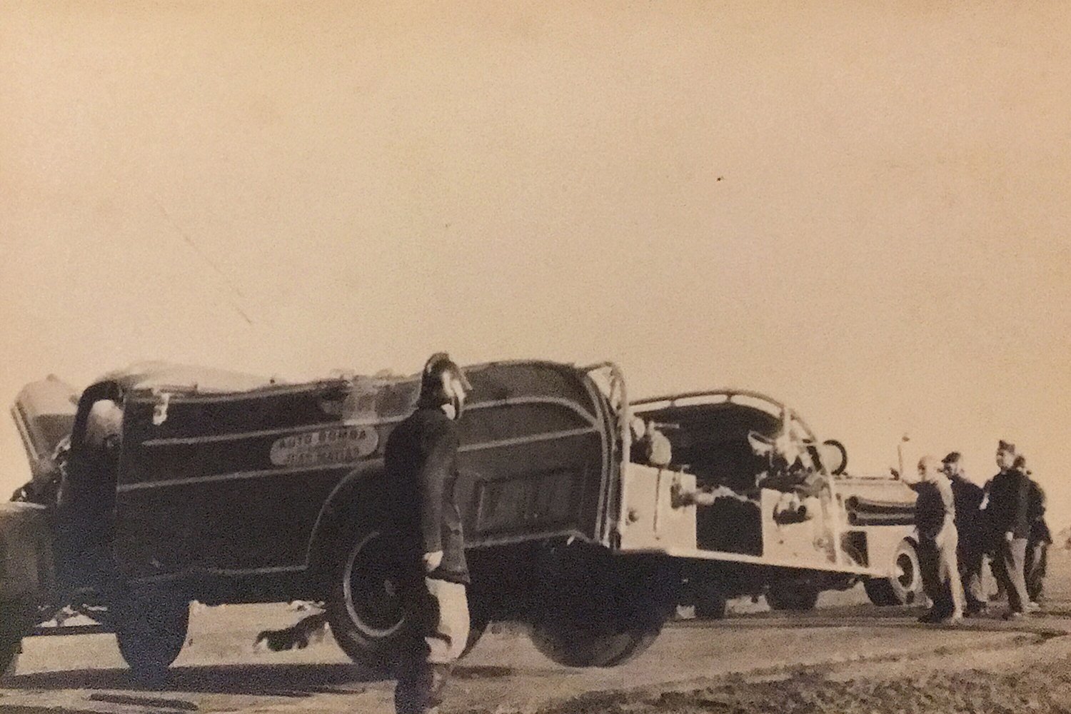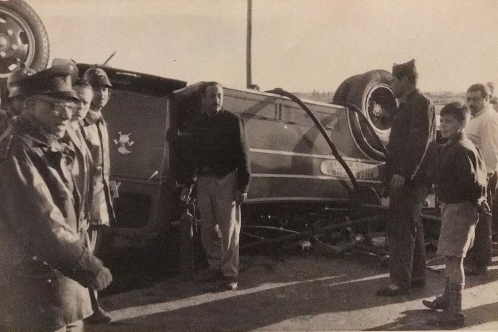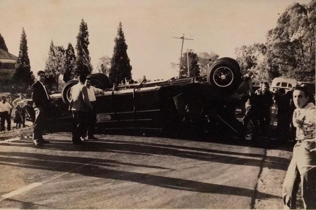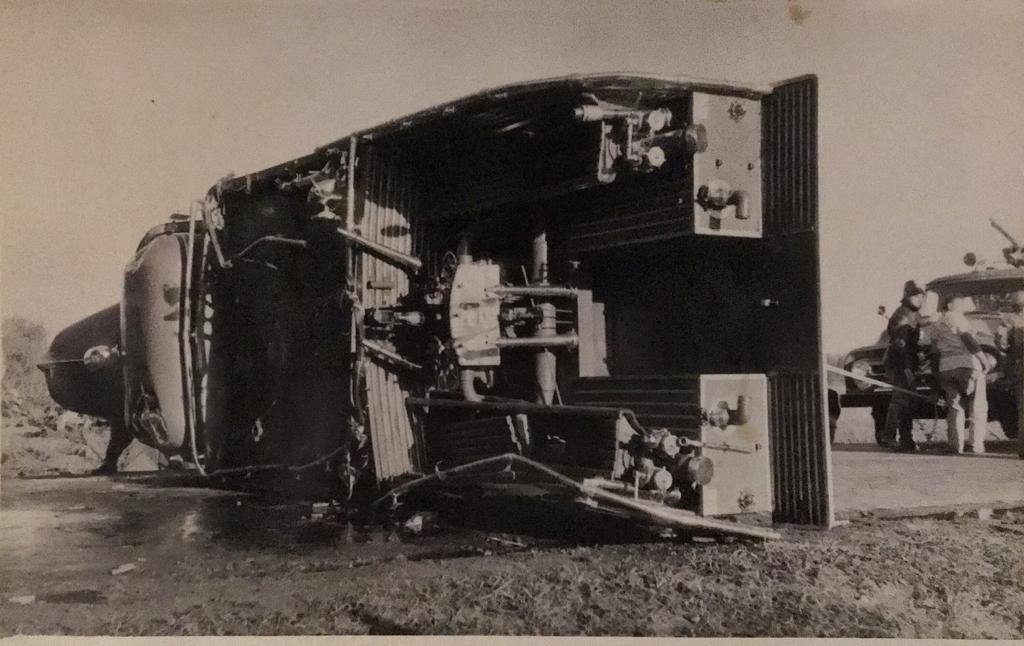 Esta vuelca y fue dando tumbos hasta clavarse en la tierra, queda ruedas arriba, no sin antes expulsar del habitáculo a sus ocupantes, el Oficial 3º Roberto Zenovio, chofer Bro Víctor Rasmussen, Auxiliar 1º Juan Antonio Ruiz, Bros Marcelo Jerez; Juan Novais ; Alberto Durron; Oscar Succo; Daniel Córdoba, el Aspirante de 19 años Oscar Alberto Suarez y el Ayudante de 1º Emilio Martínez.